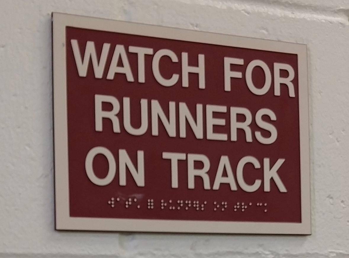 The commitment to accessibility is admirable, but somehow a Braille sign warning about runners feels… ironic? Still, shout out for including everybody—even those who need a heads-up, literally, about a track meet.