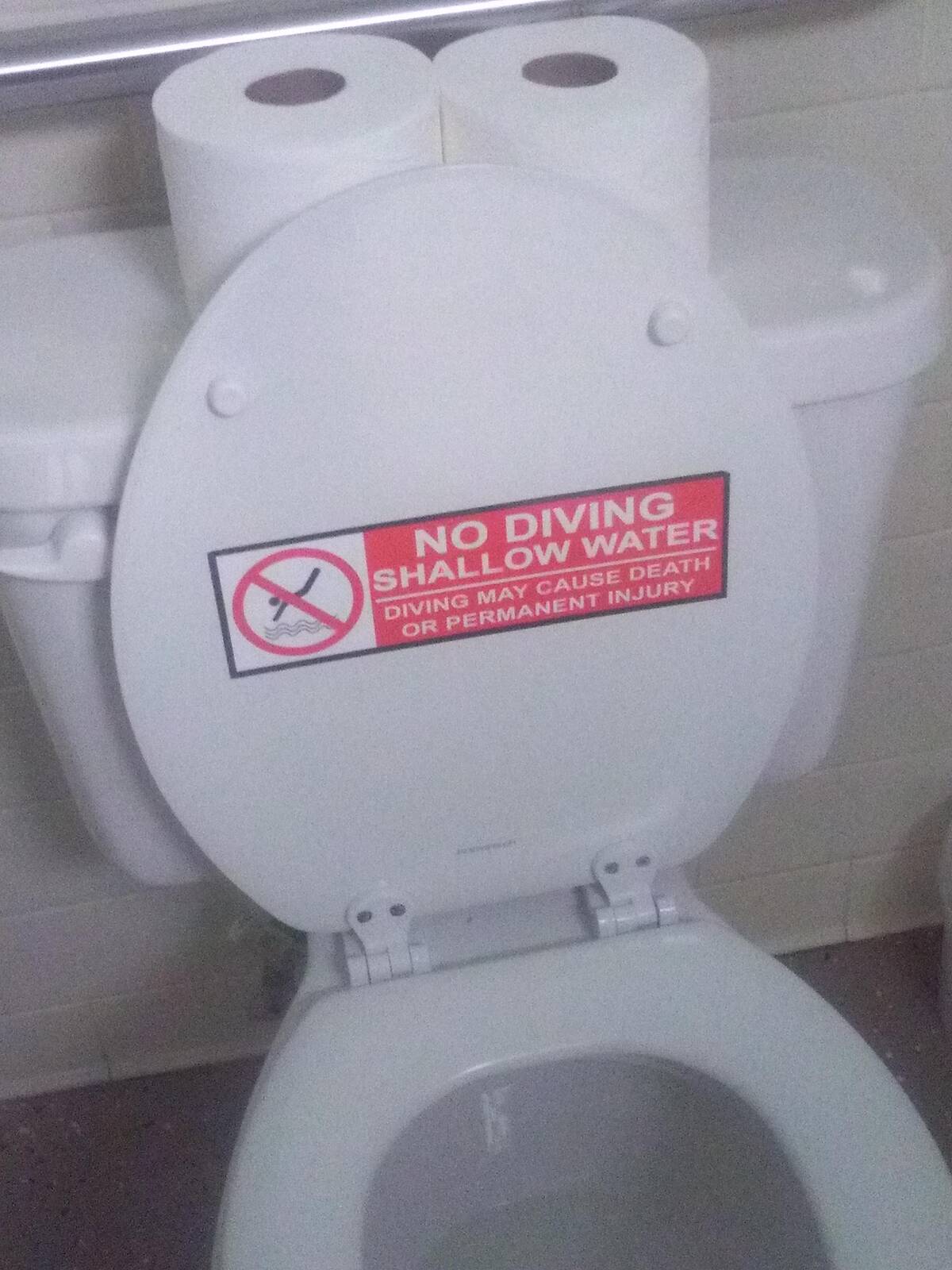 That’s some next-level warning placement. Thank goodness for the ‘No Diving’ sign on the toilet—my inner daredevil was about to make a very bad decision. Permanent injuries averted thanks to some solid bathroom signage.