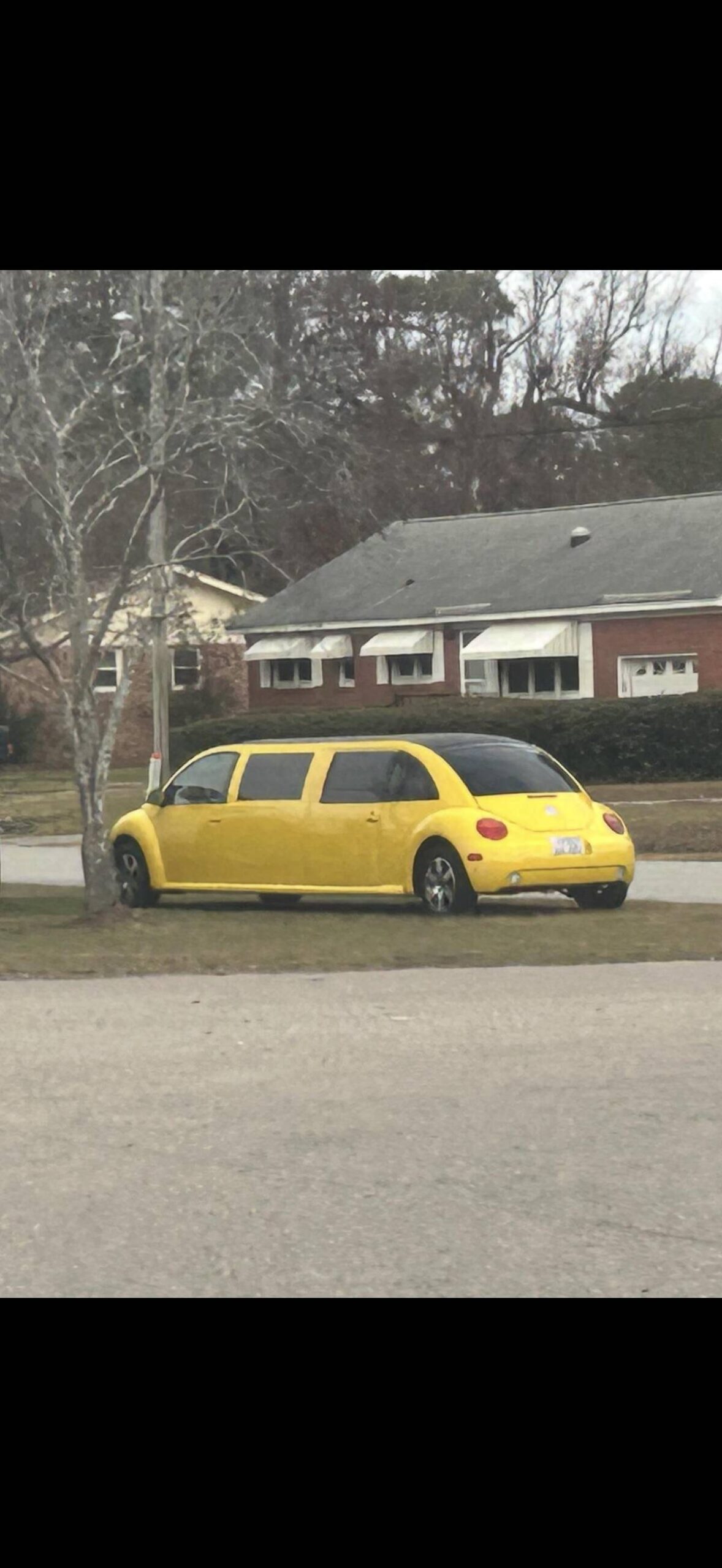Not sure if this is a limo or just Beetle cosplay gone too far. This is like someone made a wishlist for everything a car shouldn’t be, then checked all the boxes. I have a lot of questions and not enough yellow paint.