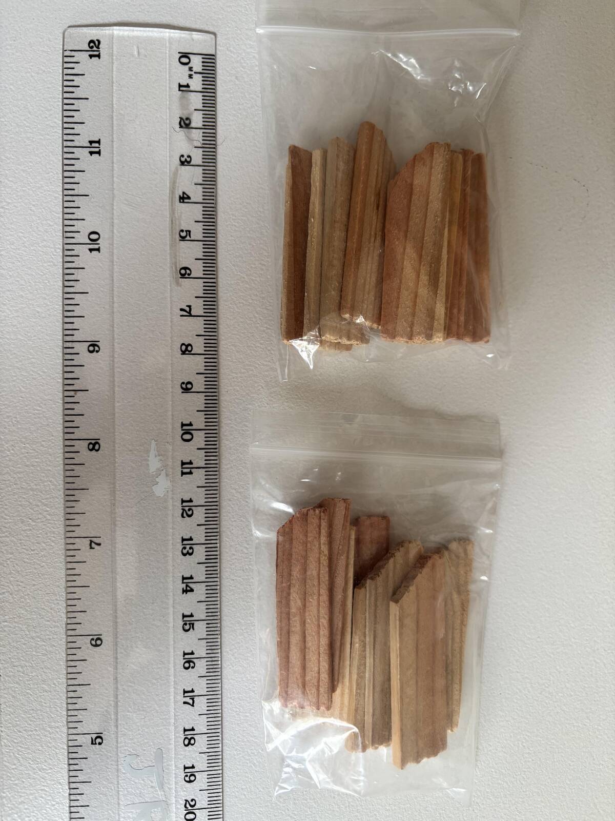 “Thin wooden slivers (5cm x 1.5cm) in plastic pouches – unscented”