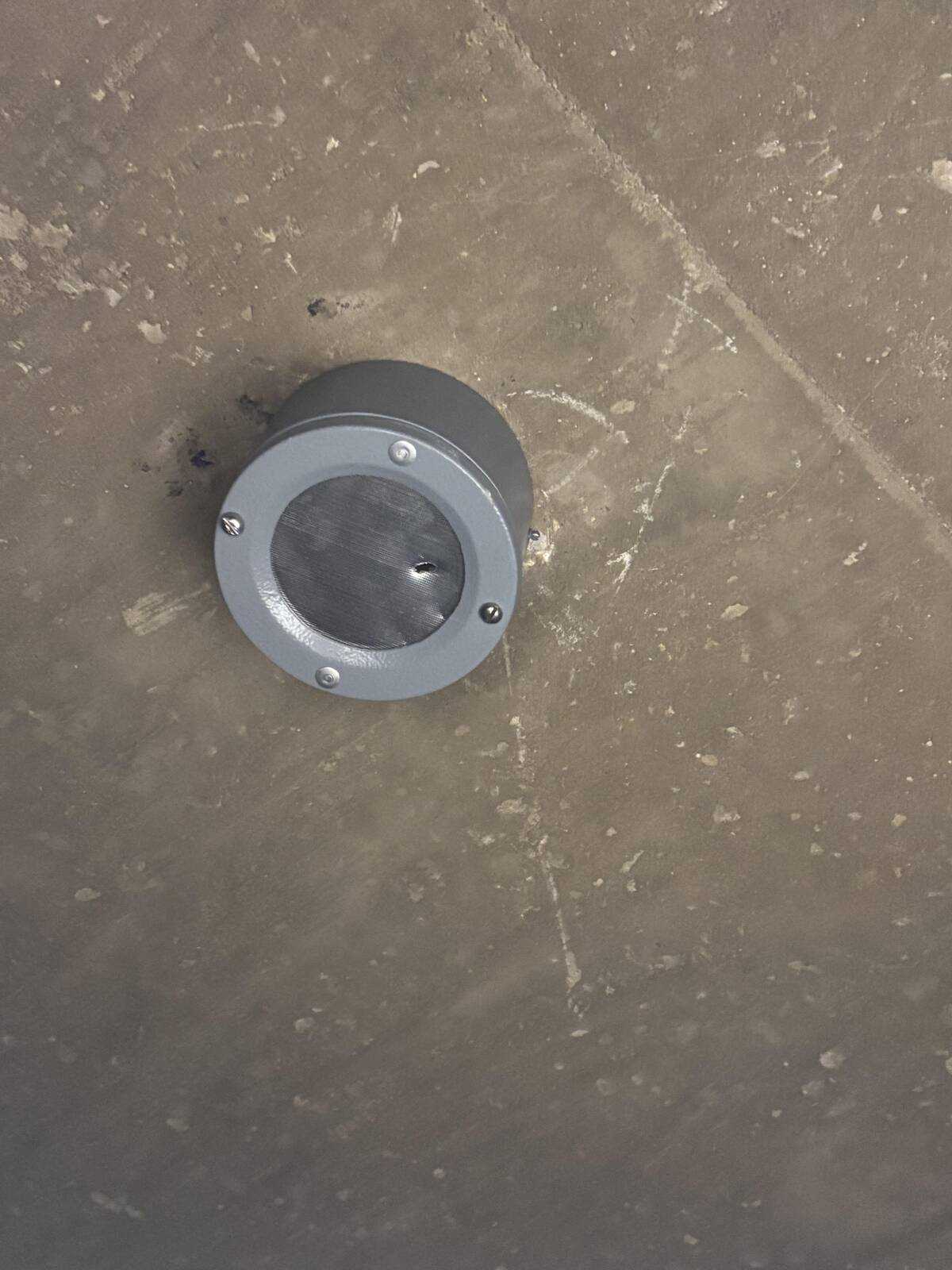 “Found this above ceiling in a converted bank vault. Couple inches across, exterior metal is seemingly made of the same material as ‘explosion proof’ electrical boxes, face has a solid metal mesh, through the hole all that could be seen was a flat black material.”