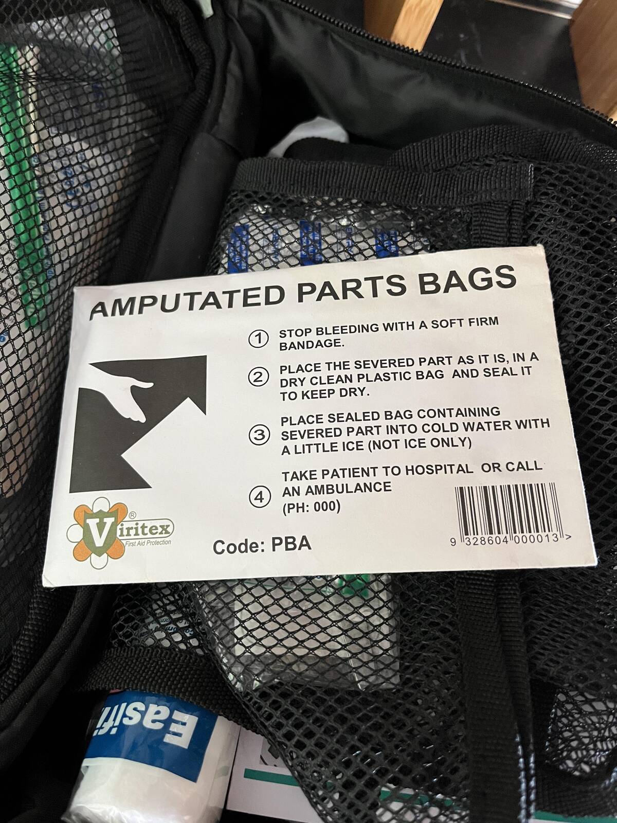 So this is what being prepared really looks like? I thought my first aid kit was thorough, but ‘amputated parts bags’ takes emergency readiness to the next level. Here’s hoping I’ll never need them, but hey—better safe than sorry!