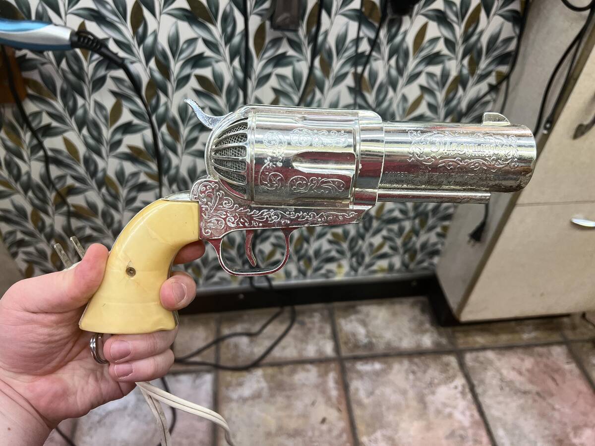 Well, that’s one way to dry hair with a bang! Never thought I’d see a hair dryer shaped like a revolver. Bet this salon gives a whole new meaning to the phrase ‘quick draw’.