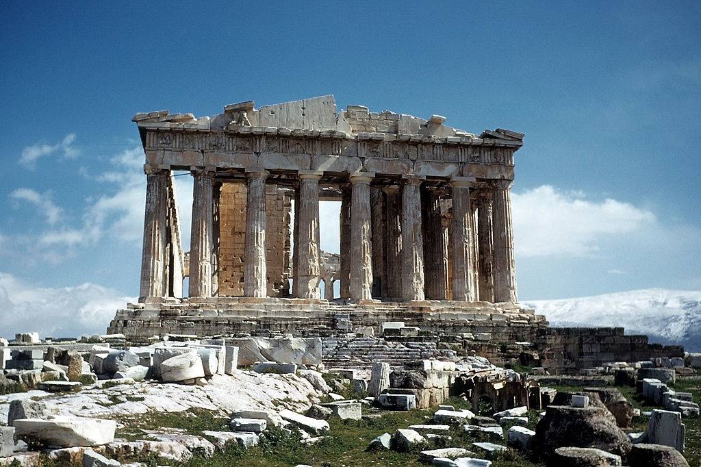 The Acropolis in Athens consists of famous Greek ruins stretched over four hills that overlook the Attica peninsula. One of its remarkable features is the Parthenon, pictured here. The ancient buildings are made of enduring limestone rock and are a marvel to explore.