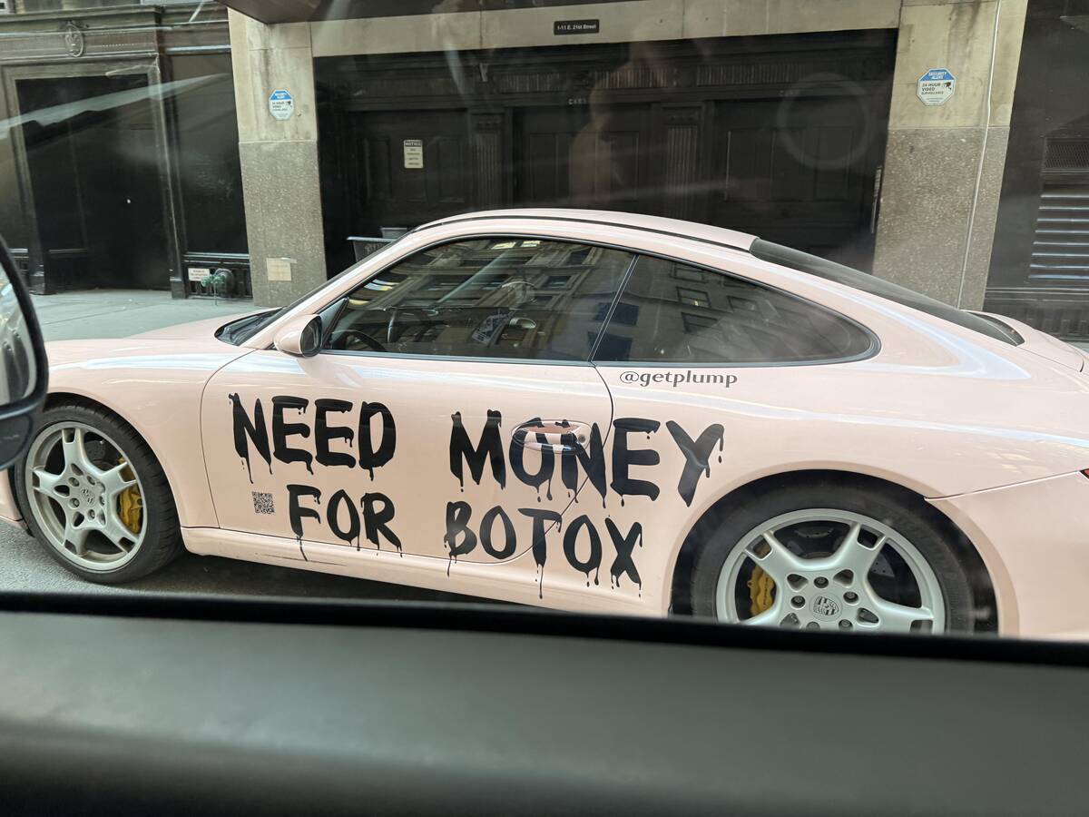 When you drive a Porsche but still need money for Botox, you know branding is everything. The hustle never ends, and neither does the need to stay plump, apparently. Ten points for honesty—and some fabulous paintwork.