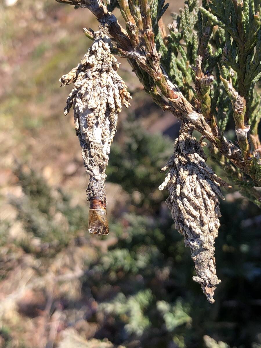 Male bagworm moths, once they emerge into their moth stage, can fly around freely. Adult females don’t have wings, so they generally spend their life cycles inside the cocoons that are seen on trees.