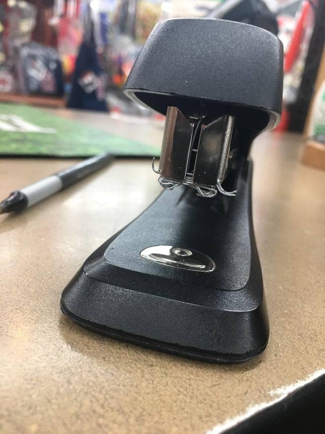 A coworker returned this stapler to their colleague after claiming “it ran out of staples.” But a quick look underneath the stapler determines that that was indeed a lie.