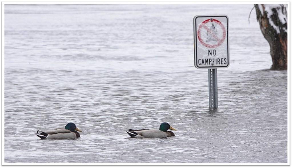 Well, I guess that solves the campfire problem. The ducks are probably wondering what the sign is for, because the only thing on fire here is their aquatic paddling. Nature really has its own sense of humor about regulations.