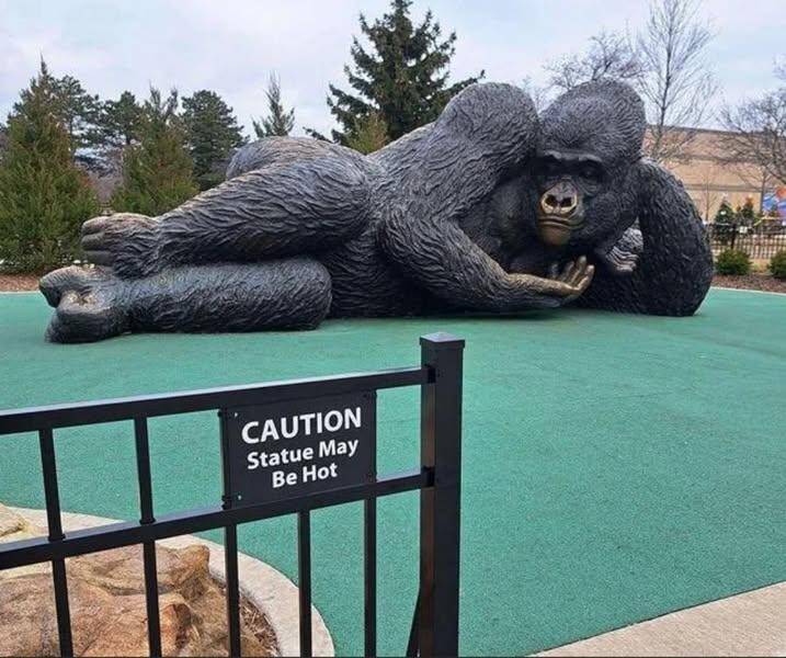 Giant gorilla statue that’s ‘hot’—in more ways than one. This sign does double duty: keep kids from burning themselves, and make adults giggle at the statue’s confident pose.