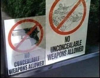 That moment when your anti-weapons policy has to mention tanks specifically… was there an incident? This sign covers all the bases—no pistols, no tanks, no exceptions. It’s probably for the best, but now I want to hear the backstory.