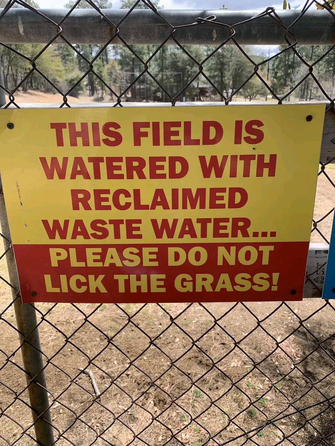 Someone felt the need to explicitly warn people not to lick waste-watered grass. The sign suggests this isn’t the first time it’s happened, which is both hilarious and slightly concerning for humanity.