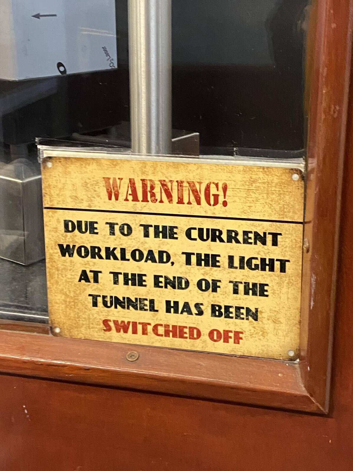 When the workload gets so intense, even the motivational light at the end of the tunnel can’t be bothered. The person who wrote this definitely deserves a long lunch break—and maybe a little extra therapy.