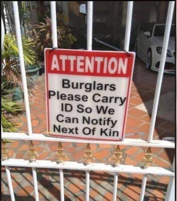 Nothing like a sign that promises danger with a sprinkle of administrative efficiency. This homeowner isn’t just ready for burglars, they want paperwork done right! Burglars, if you forget your ID, apparently your next-of-kin will never know. I don’t know whether to be worried or impressed.