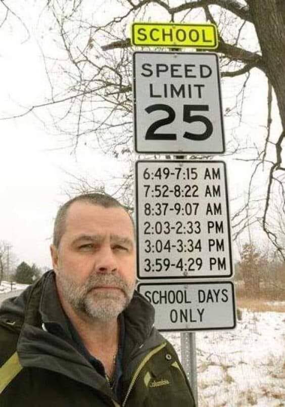 That’s it, I’m going around. The school speed limit times alone are impossible to decode—can we get a Rosetta Stone for these? Honestly, who decided these times? It looks more like a secret code than a traffic rule.