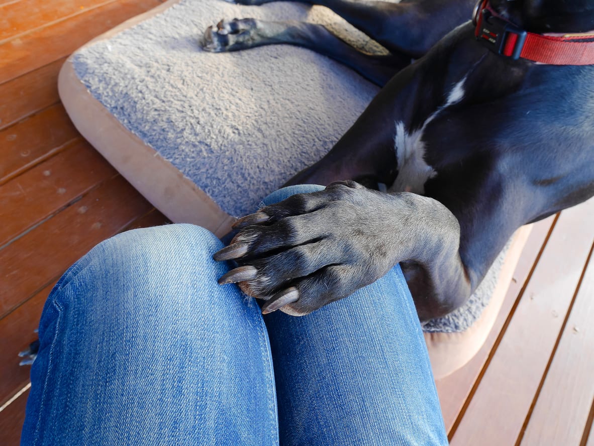 Dog behaviorist Rebecca Forrest wrote about the topic at The Dog Clinic. She says that dogs are actually trying to communicate with you when they lay their paws on you. They can’t speak, so a little paw language will have to do!