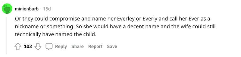 In a later comment, the husband says that after giving it some thought, he’s not actually going to refuse to sign his daughter’s birth certificate, but that as a compromise, he’s going to try to sell his wife on the name “Everly Winter Rain” instead.