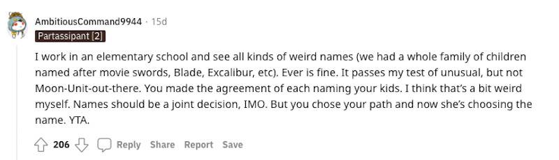 “Overall, I’ve changed my judgment to [not the jerk] for attempting to push back against ‘Ever Winter Rain’ because it indeed sounds like a new Taylor Swift track and no kid should have to bear that name forever,” commented one user.