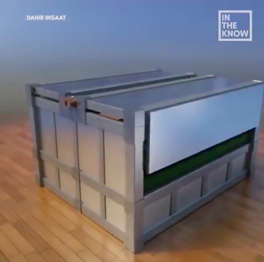 Russian inventor Dahir Insaat came up with the design for the earthquake-proof bed. It looks and behaves like a regular bed until it detects an earthquake. At that point, the bed basically swallows you whole. Then a metal roof shuts over the top.