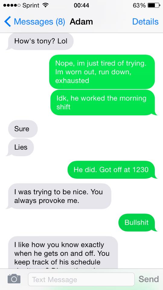 First, he’d frequently send her a barrage of paranoid texts while she was on shift at work, despite the fact that she wasn’t allowed to have her phone while on the clock.